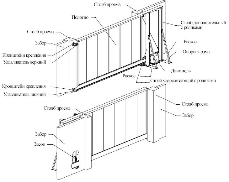 Откатные ворота представляют собой самонесущую конструкцию, в которой алюминиевая рама ворот с заполнением перемещается по роликовым опорам, установленным на фундаменте вне зоны проезда ворот (за проемом).